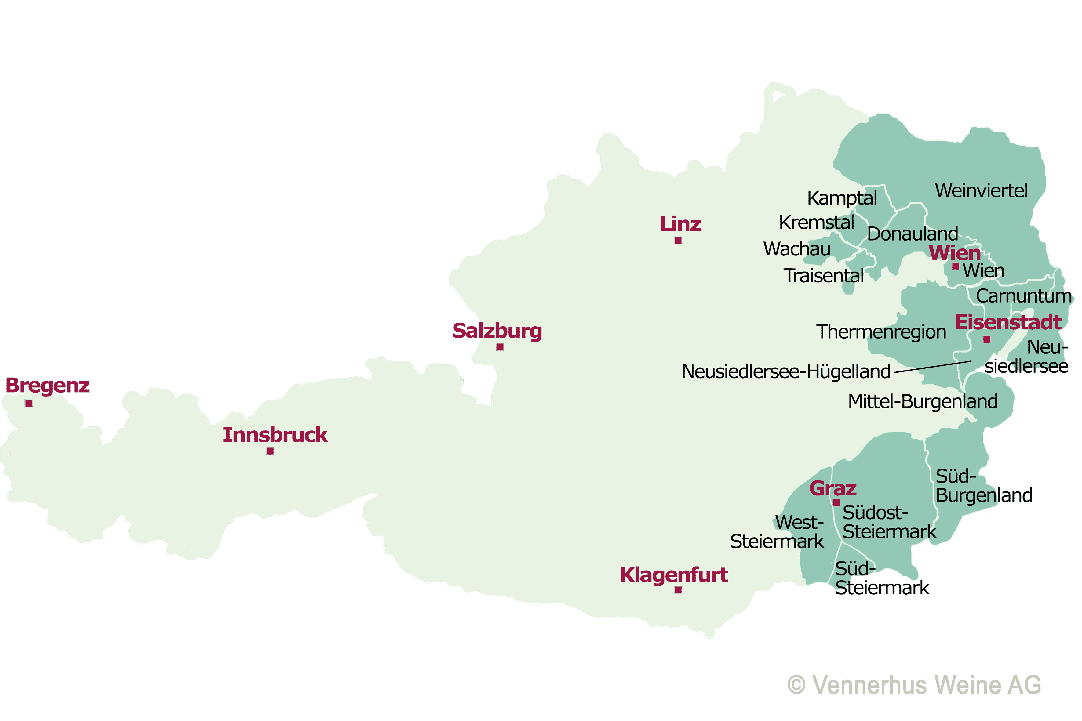 Das Burgenland ist das östlichste Bundesland und die zweitgrösste Weinbauregion Österreichs. Es unterteilt sich in die Anbaugebiete Neusiedlersee, Neusiedlersee-Hügelland, Mittelburgenland und Südburgenland. Geografisch bildet es den westlichen Abschluss der ungarischen Tiefebene und kann mit leichten Sand- und Schotterböden im Seewinkel aber auch mit schweren, eisenhaltigen Tonböden im Südburgenland aufwarten. Aber nicht nur deshalb sind die natürlichen Bedingungen für den Weinbau nahezu vollkommen. Das im Sommer heiss-trockene und im Winter frostig-kalte pannonische Klima wird durch die Wassermassen des Neusiedlersees gemildert, indem er viel Luftfeuchtigkeit abgibt und die Sommerwärme bis weit in den Herbst hinein speichert. Somit können sowohl weisse Reben wie Grüner Veltliner, Welschriesling, Chardonnay und Weissburgunder als auch roten Traubensorten wie Blaufränkisch, St. Laurent und Zweigelt wunderbar reifen. Die nebelfeuchten Herbsttage begünstigen auch das Wachstum von Botrytis Cinera an den vollreifen Trauben, aus denen unvergleichlich delikate Beeren- und Trockenbeerenauslesen gekeltert werden.